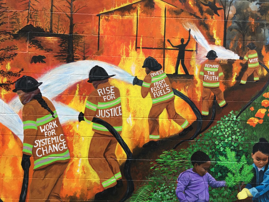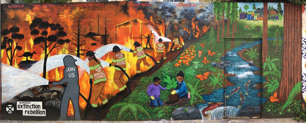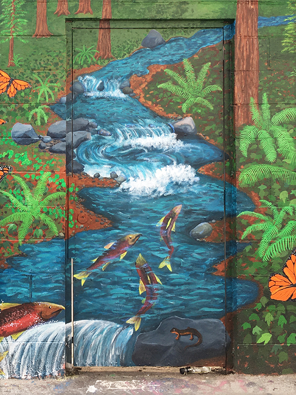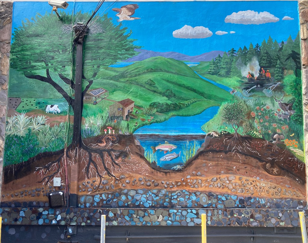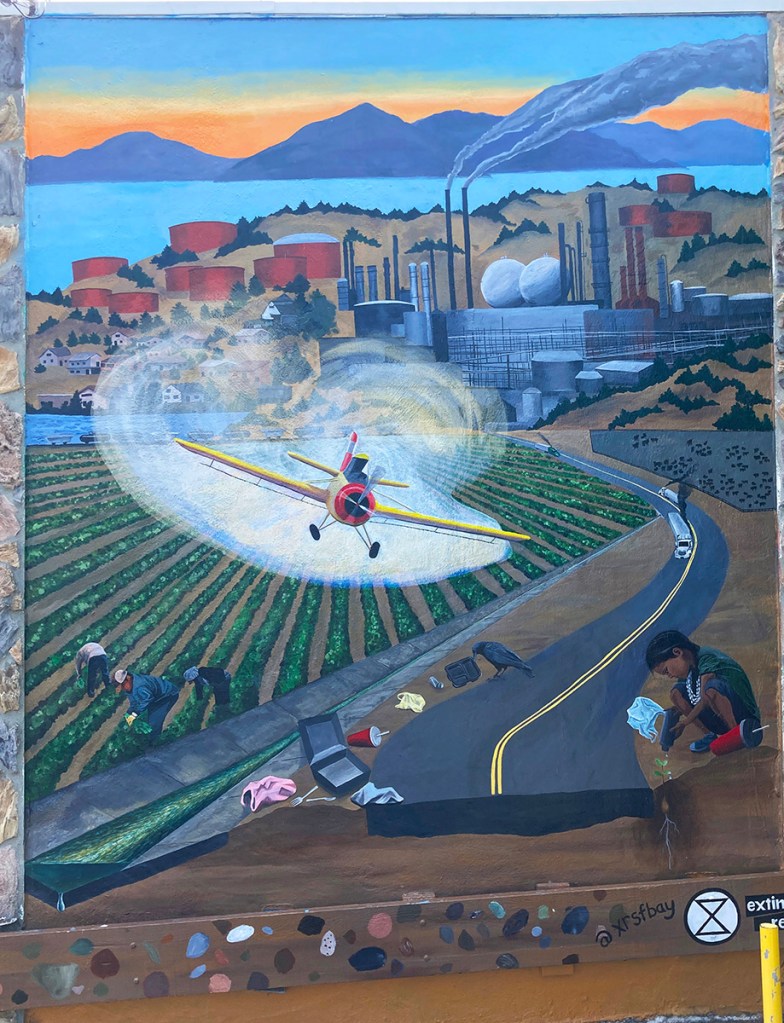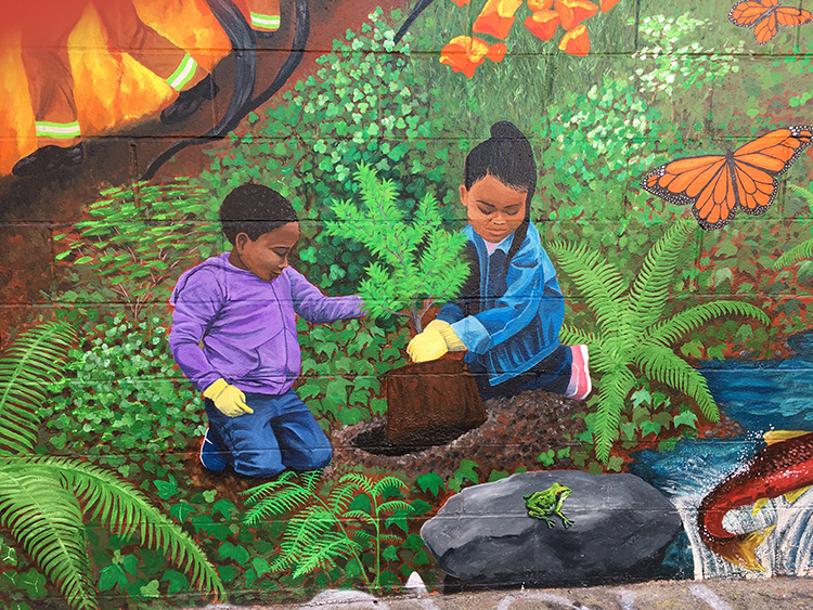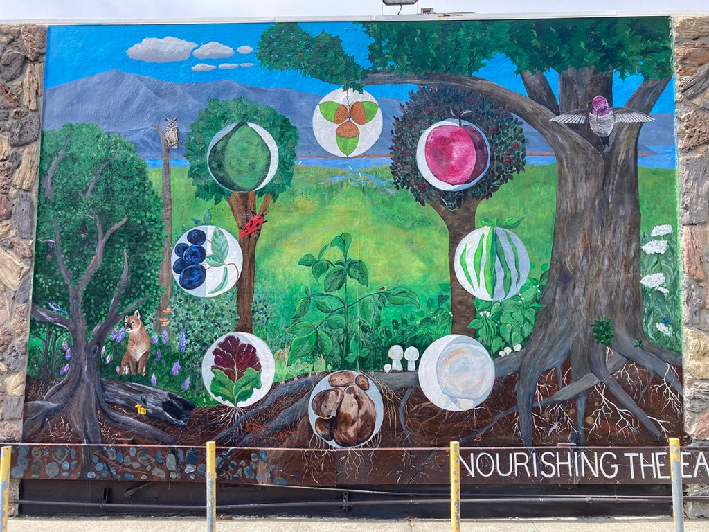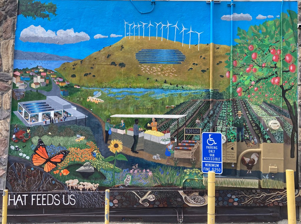 “Nourishing The Earth That Feeds Us”, located on the Arlington Market in Richmond, CA, is a community-centric vision of sustainability and how to get there. The work has been about a mindful collaborative process. Shoppers see how food grows and connects us to nature. They would see us work, and how the artist connects to the painting. Neighbors of the market, of all ages, have made their mark, creating a genuine community piece. Patrons love details of the local view of the Bay, hills and Native flora and fauna. One panel depicts current destructive agricultural practices, two show sustainable methods to benefit natural systems, and one imagines food grown in balance with nature. We have had gracious support from the market owners and their large extended family. We strive to inspire this community and beyond.